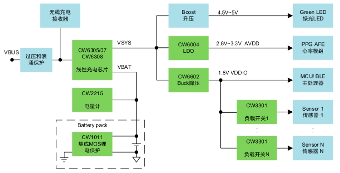 隨著技術(shù)的飛速發(fā)展,智能指環(huán)作為新興智能可穿戴設(shè)備越來(lái)越被品牌廠商所關(guān)注。中國(guó)穿戴廠商華米在CES 2024期間發(fā)布了名為Helio Ring的智能指環(huán)新品;韓國(guó)三星電子于2024年7月正式發(fā)售指環(huán)產(chǎn)品Galaxy Ring,市場(chǎng)反響熱烈。智能指環(huán)既有裝飾潮品的時(shí)尚屬性,又是智能手機(jī)的輔助智能感知配件,用于人體健康數(shù)據(jù)的監(jiān)測(cè)。相比手表和手環(huán),指環(huán)更貼合皮膚,因此在收集人體基礎(chǔ)生物信息,如脈搏、心率、血氧、心電圖,以及監(jiān)測(cè)體溫等方面更有精準(zhǔn)度優(yōu)勢(shì)。指環(huán)相比智能手表,還有無(wú)感佩戴的特點(diǎn),更能滿(mǎn)足用戶(hù)的差異化需求。智能指環(huán)受限于空間尺寸,配備的鋰電池容量通常在15~23mAh,而續(xù)航時(shí)間則需要達(dá)到5天或更久。因此,超低功耗且超小尺寸的芯片必為產(chǎn)品開(kāi)發(fā)者所青睞。賽微微電(CellWise)已經(jīng)量產(chǎn)多款超低功耗的小尺寸電源芯片,如Figure1所示,都非常適用于智能指環(huán)應(yīng)用。Figure 1.智能指環(huán)電源方案線(xiàn)性充電器-CW6308、CW6305/6307CW6308是一款支持I2C接口和電源路徑管理的線(xiàn)性充電芯片,尺寸為業(yè)內(nèi)最小,充電電流最大支持320mA。在僅有電池供電并開(kāi)啟Watchdog功能后,芯片工作電流仍低至5μA。CW6308還支持500nA超低功耗模式和300nA船運(yùn)模式,封裝為WLCSP-9,尺寸為1.24mm*1.24mm。CW6305/6307功能與CW6308一致,區(qū)別是可支持最大470mA充電電流,芯片封裝尺寸為WLCSP-9,1.55mm*1.55mm。電量計(jì)-CW2215單節(jié)鋰電池電量計(jì)CW2215的工作電流僅為5μA,是業(yè)內(nèi)最低,內(nèi)置高精度ADC,支持電壓、電流和溫度監(jiān)測(cè)。芯片內(nèi)置“FastCali”算法,結(jié)合對(duì)客戶(hù)電池樣品建模測(cè)試提取的電池特征參數(shù),可完成對(duì)電池剩余電量(SOC)、循環(huán)數(shù)(Cycle)和電池健康(SOH)的精確計(jì)算,并可配置對(duì)低電量、高溫或低溫的情況進(jìn)行中斷上報(bào)。CW2215為WLCSP-9封裝,尺寸為1.58mm*1.53mm。LDO低壓差穩(wěn)壓器-CW6004CW6004是一款超低功耗LDO,靜態(tài)工作電流低至300nA。其輸入電壓1.6V~5.5V,輸出電壓有1.1V, 1.2V, 1.5V, 1.8V, 2.5V, 2.8V, 3.0V和3.3V可選,輸出電流為200mA。CW6004具有快速的動(dòng)態(tài)響應(yīng)特性,當(dāng)設(shè)備從Standby輕載快速切換到Active重載的工作場(chǎng)景下,VOUT輸出電壓也能保持穩(wěn)定。該芯片為DFN-4封裝,尺寸為1.0mm*1.0mm。Figure 2.  CW6004靜態(tài)電流vs輸入電壓Figure 3.  CW6004 Ground電流vs 輸出電流Buck降壓轉(zhuǎn)換器-CW6602、CW6603CW6602是一款超低功耗Buck降壓轉(zhuǎn)換器,輸入電壓為2.15V~5.5V,輸出電壓為1.2V~3.3V共8檔可選。其靜態(tài)工作電流低至330nA,負(fù)載電流能力為0.6A/峰值電流1.0A。在1.8V輸出電壓時(shí),芯片的重載效率達(dá)90%以上,100uA輕載的效率也可達(dá)85%。該芯片具有快速的負(fù)載動(dòng)態(tài)響應(yīng)能力,封裝為WLCSP-8,尺寸為1.575mm*0.825mm。CW6603的功能和尺寸與CW6602一致,區(qū)別是輸出電壓范圍為0.6V~1.2V。Figure 4.CW6602 Vout=1.8V的轉(zhuǎn)換效率負(fù)載開(kāi)關(guān)-CW3301CW3301是一款超低MOS導(dǎo)通電阻的負(fù)載開(kāi)關(guān),輸入電壓為1.1V~5.5V,最大通流能力2.0A。芯片的輸出電壓擺率(slew-rate)受控,有效保護(hù)后級(jí)芯片;CW3301具有業(yè)內(nèi)領(lǐng)先的5nA On-State靜態(tài)工作電流和12nA Off-state漏電流,并支持輸出快速放電可選;其封裝為WLCSP-4,尺寸為0.76mm*0.76mm。鋰電保護(hù)-CW1011CW1011為單節(jié)鋰電池保護(hù)芯片,支持高精度過(guò)壓、欠壓、充電過(guò)流、放電過(guò)流和短路保護(hù)。芯片內(nèi)部集成了54mΩ導(dǎo)通電阻的Dual MOSFETs;其靜態(tài)工作電流為2.5μA,并支持休眠模式,功耗低至20nA。CW1011的封裝為DFN-6,尺寸為2.0mm*1.5mm。賽微微電(CellWise)深耕超低功耗電源技術(shù)多年,在智能手表、TWS耳機(jī)、主動(dòng)手寫(xiě)筆、無(wú)線(xiàn)藍(lán)牙鍵鼠等可穿戴設(shè)備和數(shù)碼配件上擁有眾多design wins。今天介紹的這些電源芯片,一定也可以助力各品牌廠商和方案開(kāi)發(fā)者,實(shí)現(xiàn)智能指環(huán)的更小空間堆疊、更長(zhǎng)電池續(xù)航和更優(yōu)用戶(hù)體驗(yàn)。感謝大家對(duì)賽微微電公司和產(chǎn)品的持續(xù)關(guān)注。